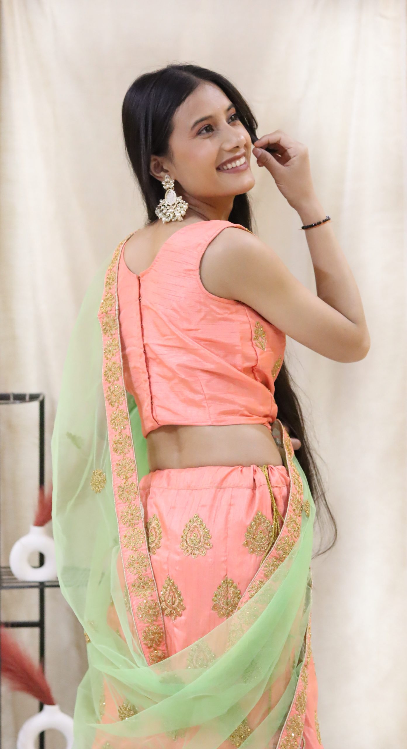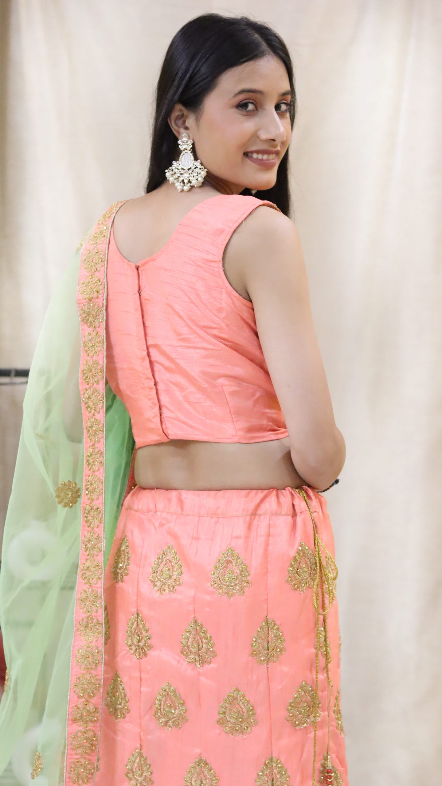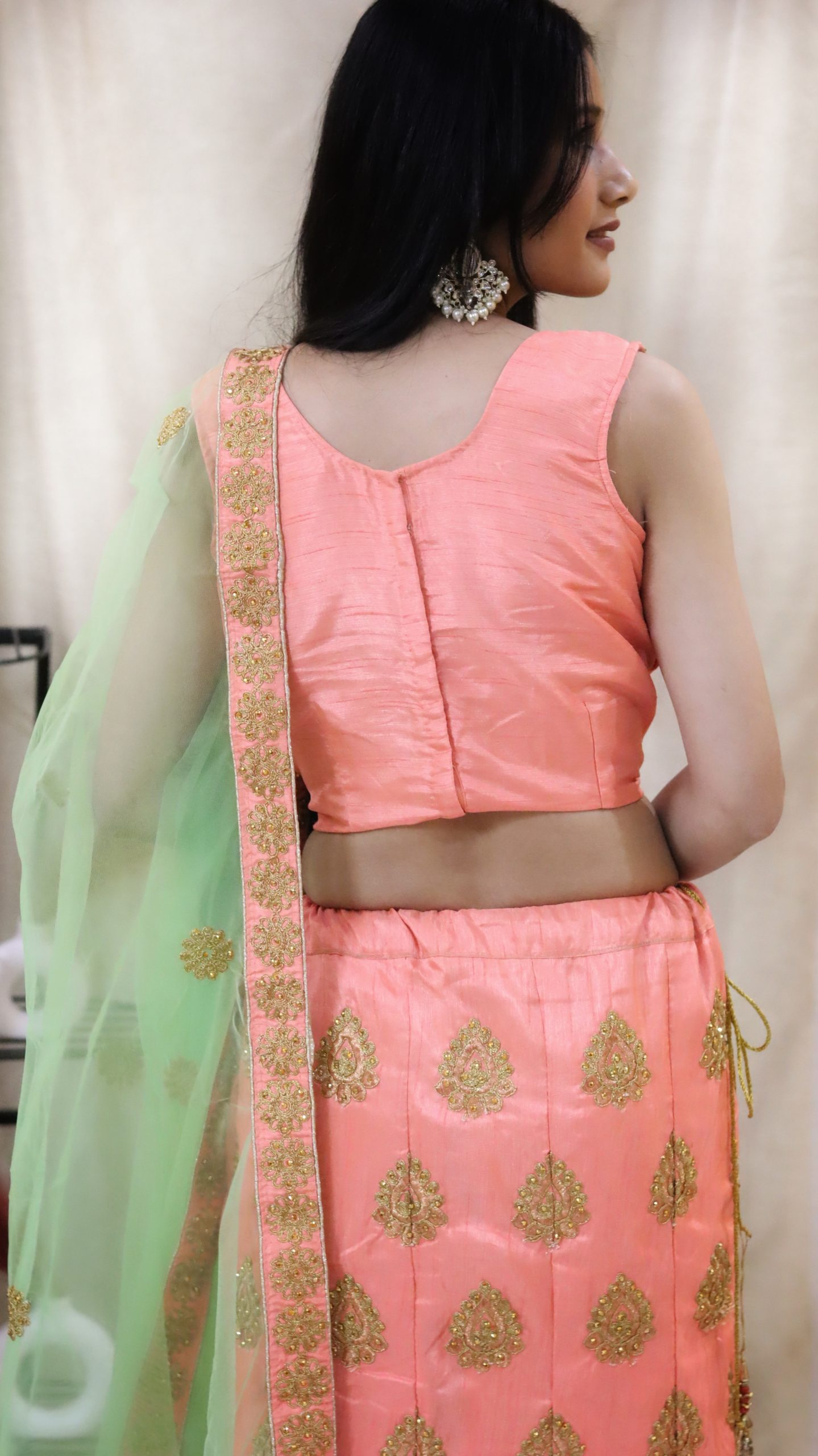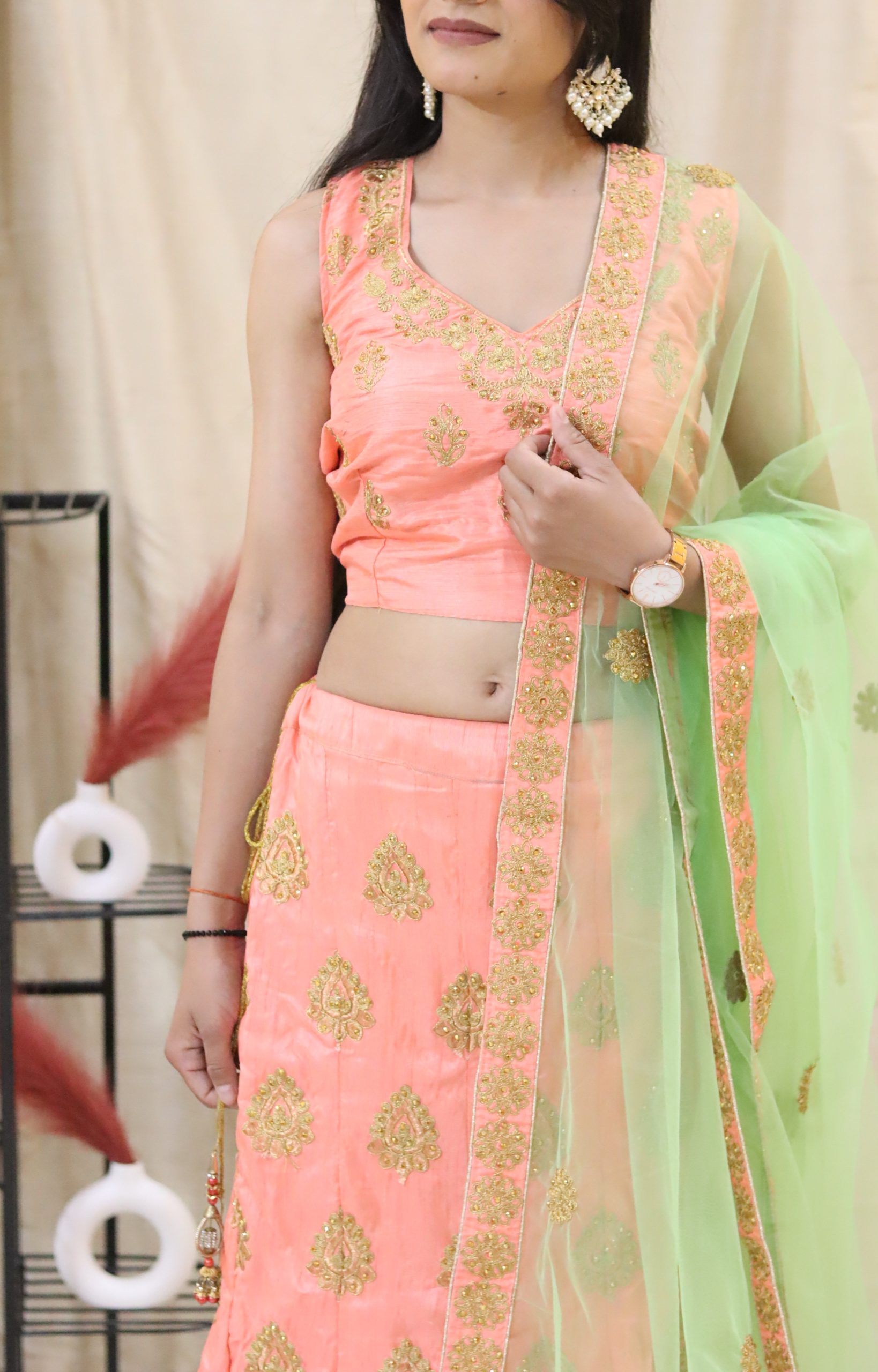 Name: Peach Colored Lahenga Intricate Embroidery With a Delicate Mint Net Dupatta with heavy Border.